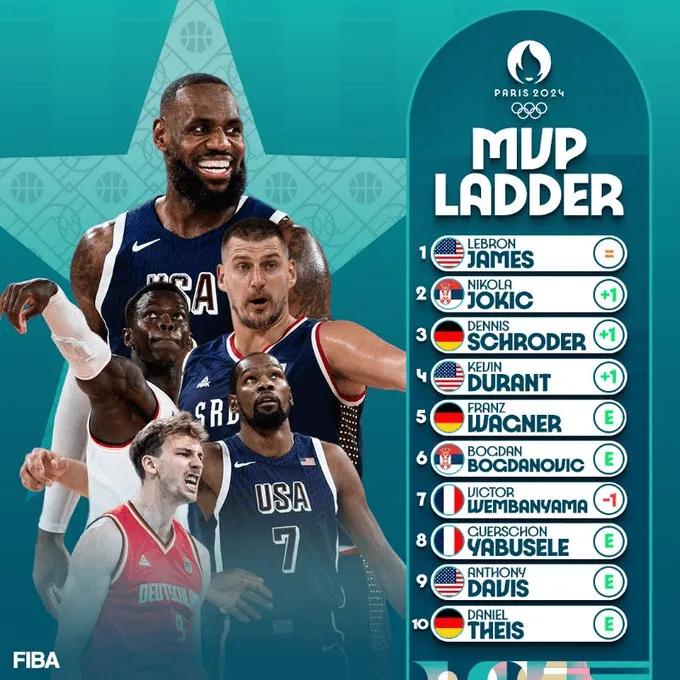 08月08日讯 FIBA国际篮联官网更新了奥运男篮MVP榜,詹姆斯继续领跑,亚历山大反超约基奇来到了第2位。