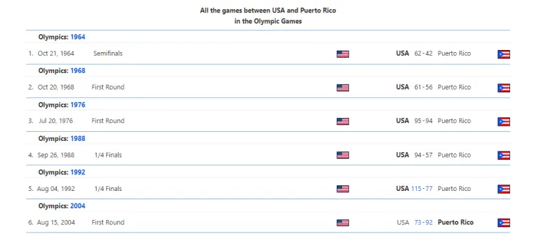 数据显示,美国队在奥运会上对阵波多黎各队5胜1负。唯一的失利是在2004年奥运会上,这也是双方最后一次奥运会交锋。