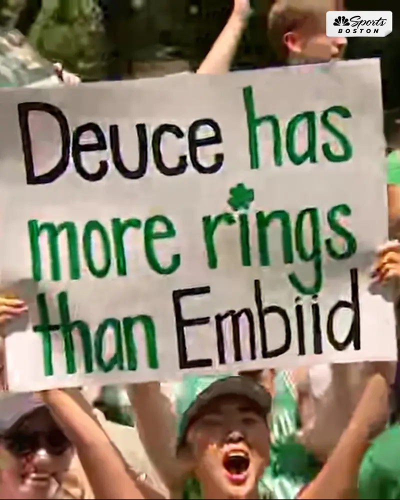 NBC波士顿频道的官方推特账号贴出了一位球迷在游行中贴出的标语:“Deuce(杰森·塔图姆的儿子)获得的戒指比恩比德更多。”