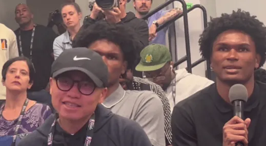 6月9日讯:在今天的总决赛赛前新闻发布会上,汤普森兄弟作为记者向东契奇提问。