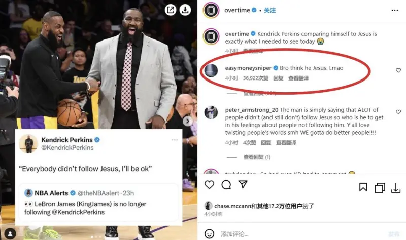 帕金斯转发了有关詹姆斯拒绝他的报道,并写道:“‘不是每个人都跟随耶稣,我会没事的。’”