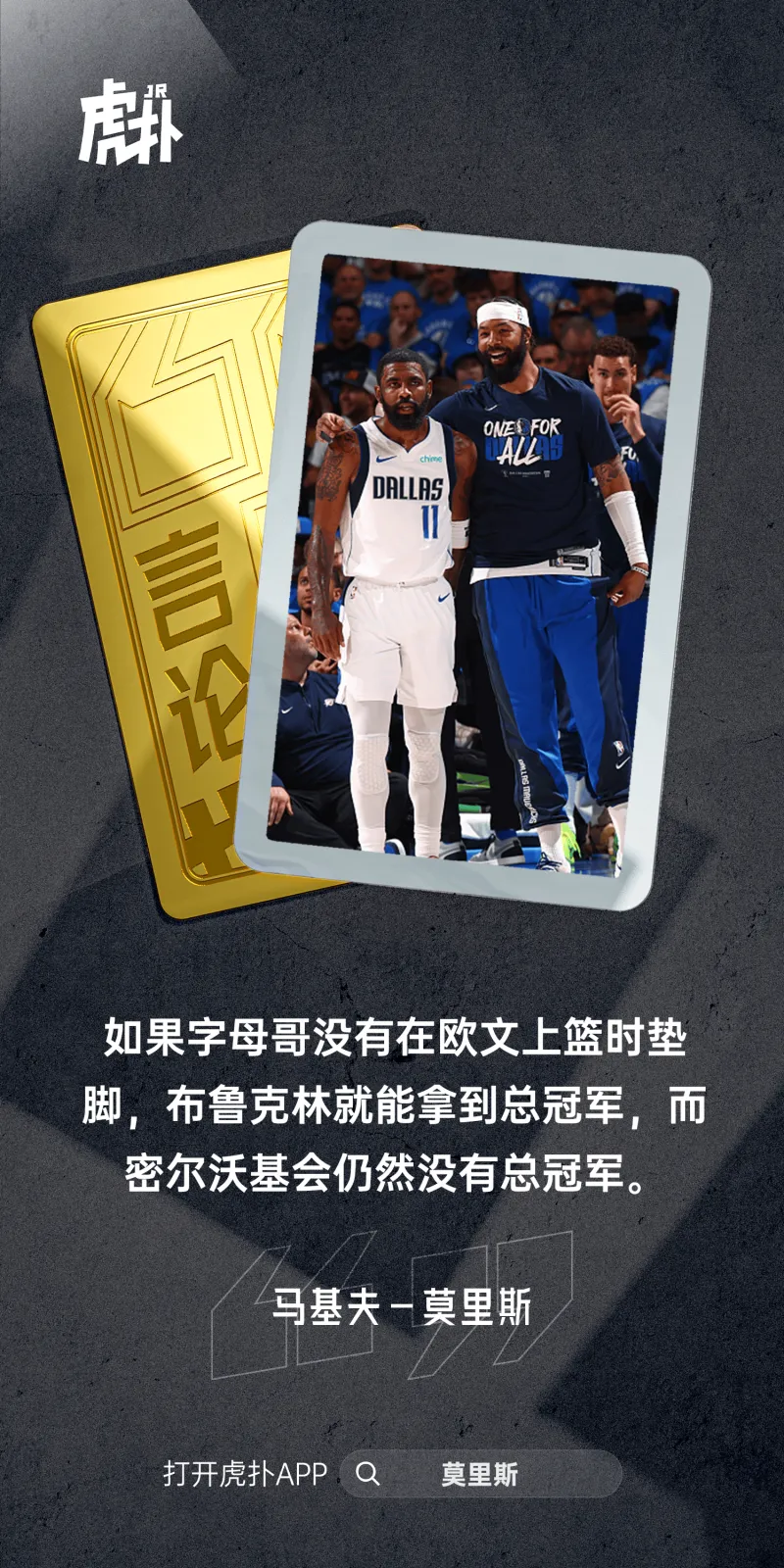 6月9日,小牛队球员莫里斯在节目中表示,如果字母哥没有伤到欧文,他仍然不会拥有戒指。
