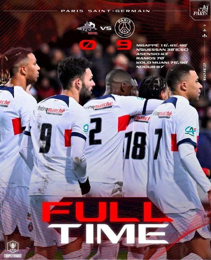 法国杯赛报:姆巴佩帽子戏法阿森西奥1射2传巴黎圣日耳曼9-0拉维尔晋级下一轮