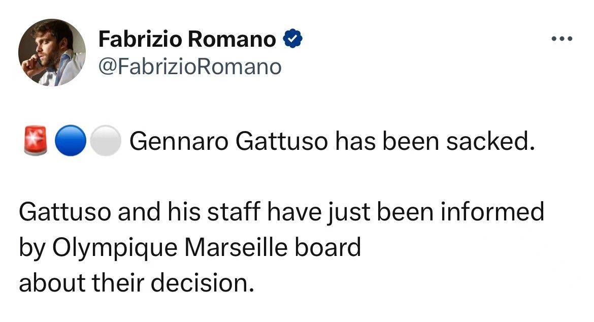 硬汉无能为力!罗马诺:马赛主帅加图索已被解雇