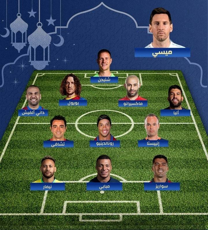 梅西将自己评为职业生涯中合作过的最好的11人球队 门将:特尔施特根 后卫:阿尔维斯、普约尔、马斯切拉诺、阿尔巴 中场:哈维、小罗、伊涅斯塔...