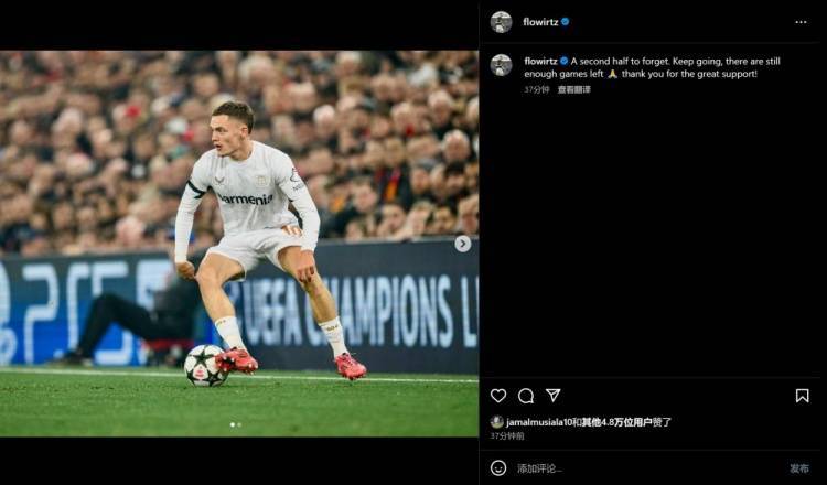 本场比赛下半场,勒沃库森被利物浦连进四球。对此,维尔茨写道:“一个需要忘记的下半场。继续加油,我们接下来还有足够多的比赛。感谢大家的大力支持。”