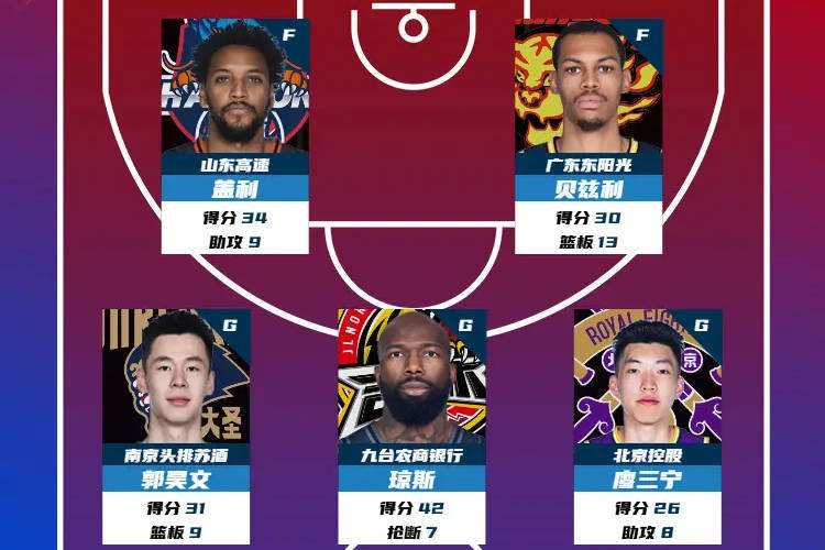 北京时间10月24日消息,2024-2025赛季CBA联赛常规赛第5轮结束较量,来自山东高速篮球俱乐部的盖利、广东宏远篮球俱乐部的贝兹利、南京同曦篮球俱乐部的郭昊文 、吉林东北虎男篮的琼斯和北京控股篮球俱乐部的廖三宁入选CBA联赛常规赛第5轮最佳阵容!
