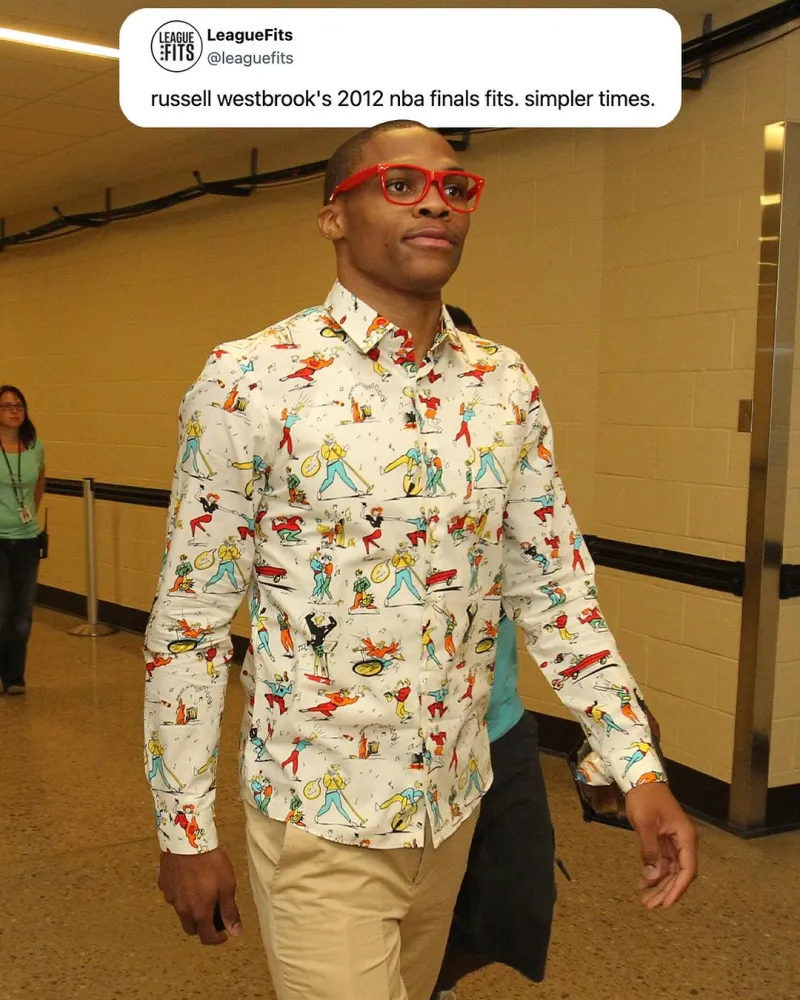 6月11日消息近日,篮球时尚媒体LeagueFits晒出了INS威少在2012年总决赛期间的赛前着装。