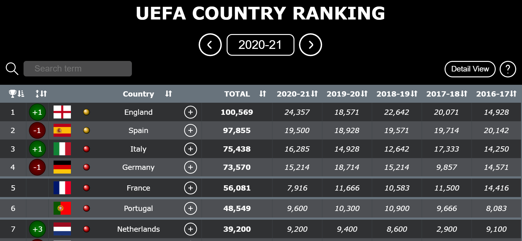 欧洲五大联赛的讨论由来已久,但随着欧足联官方声明法甲已经跌出五大联赛之外,关于“法甲是否仍被视为五大联赛之一”的讨论开始了。 ”成为热门话题。我们先来介绍一下目前欧足联欧战积分情况。法甲积分已跌出欧洲前五 巴黎无法阻止下降趋势 梅西和姆巴佩逃跑有道理吗?2020-21赛季,法甲5年欧战积分为56.081分。与前四名(第四名73.570分)的差距拉大,但相比葡超(48.549分)优势不小。当时外界普遍认为法甲保住第五名的压力不大。法甲积分已跌出欧洲前五 巴黎无法阻止下降趋势 梅西和姆巴佩逃跑有道理吗?